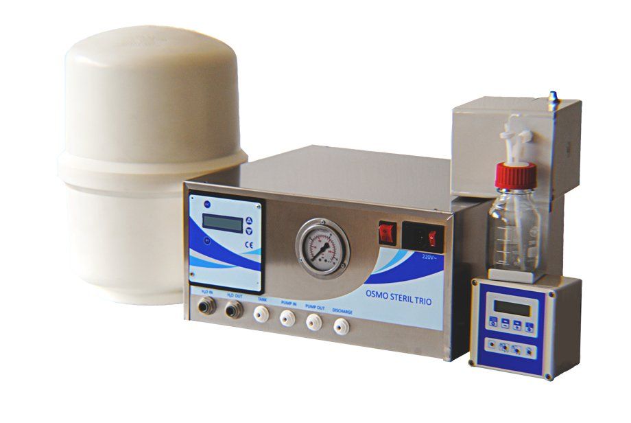 Osmo Steril, nuestro equipo centralizado para las clínicas dentales, ofrece de manera totalmente automática agua pura y desinfectada a los sillones odontológicos y al fregadero de esterilización, además de agua desmineralizada para las autoclaves.